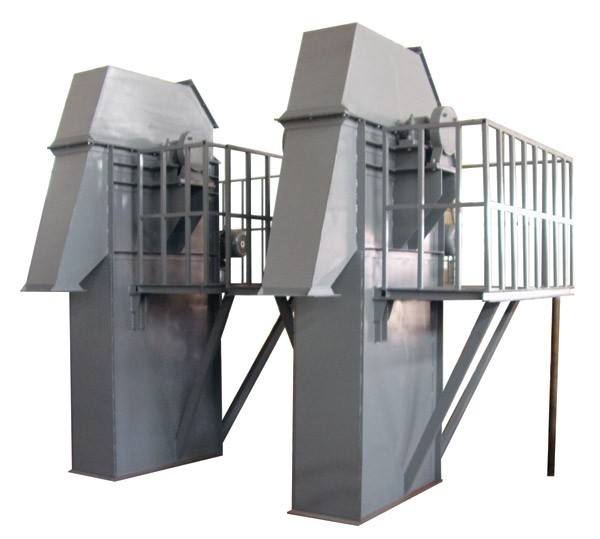 NE型板鏈斗式提升機(jī)的牽引件為板鏈,料斗以一定的間隔固定在牽引件上,牽引件經(jīng)提升機(jī)頭部和底部的鏈輪,構(gòu)成上升的有載分支和下降的無載分支的閉合環(huán)形系統(tǒng),設(shè)置在提升機(jī)頭部的驅(qū)動(dòng)裝置經(jīng)頭部鏈輪將動(dòng)力傳給牽引構(gòu)件和料斗,物料經(jīng)設(shè)置提升機(jī)底部的進(jìn)料口進(jìn)入提升機(jī)料斗,料斗將物料提升到頭部并在頭部將物料卸出,離開料斗的物料經(jīng)設(shè)置在提升機(jī)頭部的卸料口卸出。提升機(jī)的料斗和牽引構(gòu)件頭輪底輪安裝在全密封的殼體內(nèi),實(shí)現(xiàn)無粉塵污染的物料輸送。