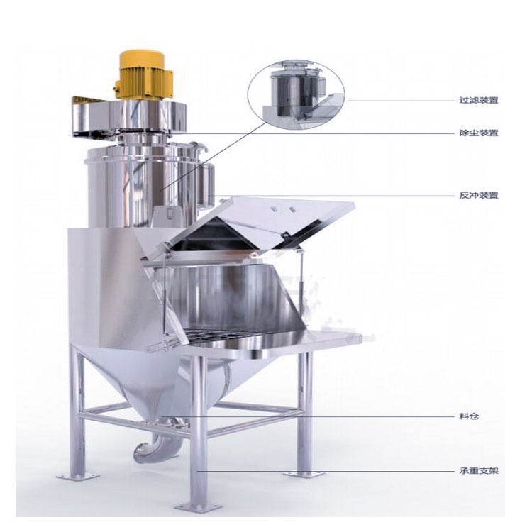 根據用戶需求而設計,將投料時產生的物料塵粉等和相關設備與人體進行有效隔離,從而在風機的負壓工況下將塵粉吸到過濾系統中,使氣體和物料分離,當物料集聚多時,因自重落入料倉。有效地排除拆包或投料帶來的粉塵,并提供一個潔凈的工作環境,符合對環保要求越來越嚴格的趨勢。