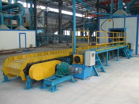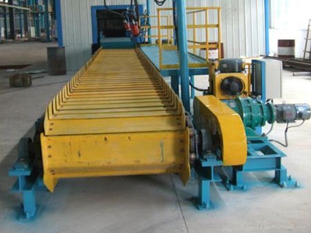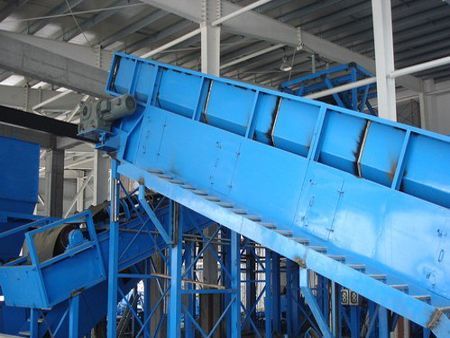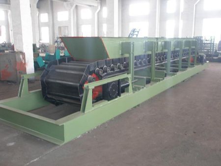 其結構特點是槽體由鋼板沖壓成帶擋邊的波浪形底板, 有足夠的強度和剛度, 牽引鏈與槽體用螺栓連接, 自重輕。該產品已廣泛用于鑄造、建材、礦山、造紙等行業, 其中已使用的產品鱗板犬寬度為2400mm, 輸送機大長度L=100m,爬升大高度為10m。