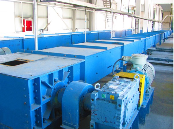 6、進料方式采用兩側大尺寸通過分流進入,使回程鏈條及刮板與進料隔離,并以不變的大尺寸料層厚度向前輸送。使鏈條及刮板回帶物料的現象不再發生。
